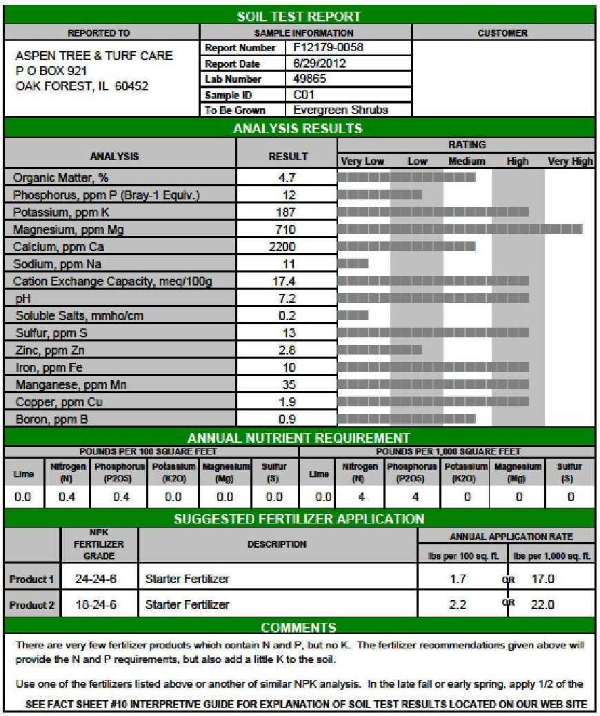 If it seems like your trees are not responding using standard fertilizer year after year, you might need to have a Soil Test. By testing the content of the soil, we can find out the actual levels of nutrients. Having too much or too little of any nutrient can limit or even injure plants and turf. Using the laboratory recommendations, we will know exactly how much to apply and what formulation we should use.