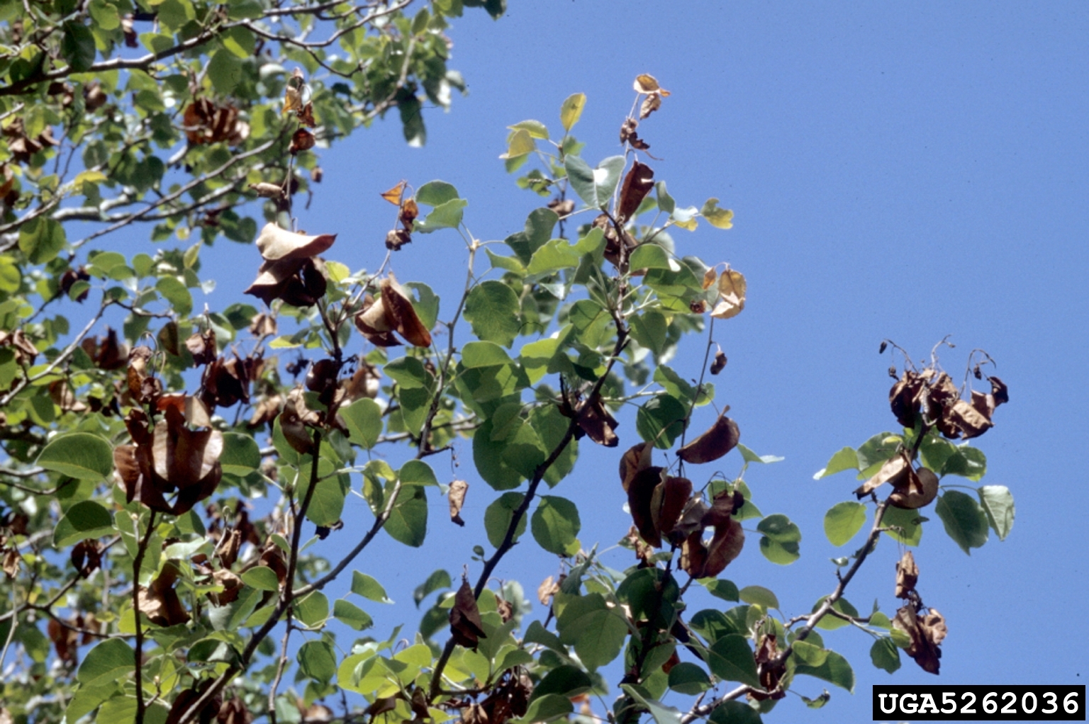 Pear trees have been getting destroyed by Fire Blight on our area and require treatment as well as removing the diseased branches from the trees. We have had some good success in treating this disease and helping trees to recover although it takes a few treatment cycles and continued trimming to remove diseased branches.
